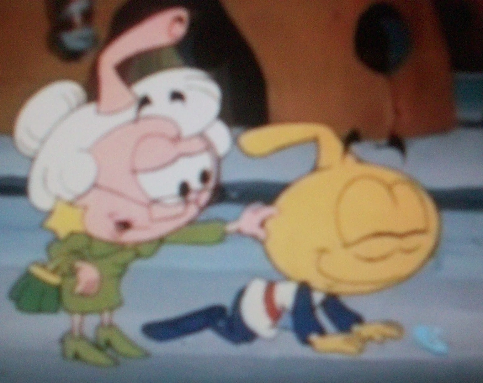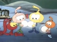 While Allstar's trying to swim Occy, they end up running into Casey, adn then Willie on the playground. They get tied up top of the swing, and each complain about their day. The Snailsman goes up to them, and they gripe because they thought the Snork Patrol kicked him out of town. He offers them a wishing peal, where each snork rubs it and makes a wish. Casey and Allstar each give him eight clams (after Casey loans Allstar two of her ten), but the Snailsman only lets Willie pay two clams. Then they each make their respective wishes - Willie wants to be big enough to ride scary rides and see scary movies, Casey wants an exciting life like Power Snork's, and Allstar wants a life like Occy's.